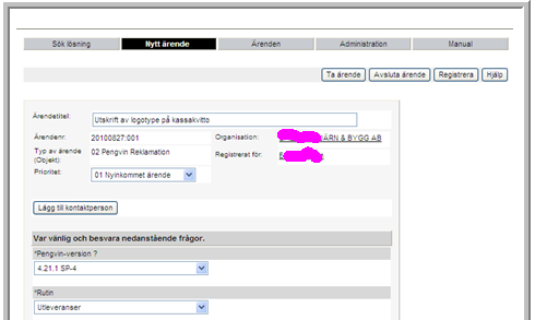 Fältet är obligatorisk. Välj (ur listboxen) den PENGVIN-version reklamationen/frågan avser. Man hittar versionsnumret i huvudmenyn.