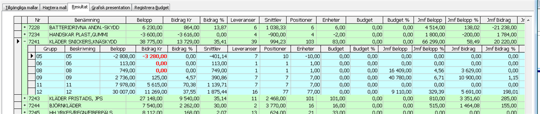 Grupperingsnivåer: ange en huvudgrupp och eventuellt undergrupp för att visa statistiken. Om två grupperingar används kan man under fliken Resultat expandera poster via ett klick på plus-tecknet. Då visas undernivåerna.