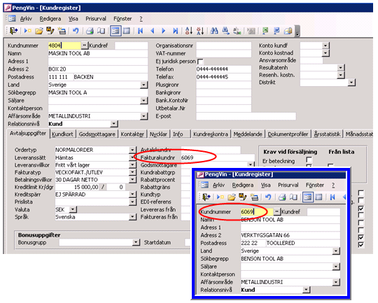 Som service till kunden kan man skicka samtliga fakturor till exempelvis huvudkontoret/moderbolaget oavsett vilken avdelning/enhet som köpt produkterna. Den fysiska fakturan går till det kundnummer som man angivit i Fakturakundnummer i kundregistret och det är också på fakturakundnumret som ev. kravbrev och räntefakturor skapas.