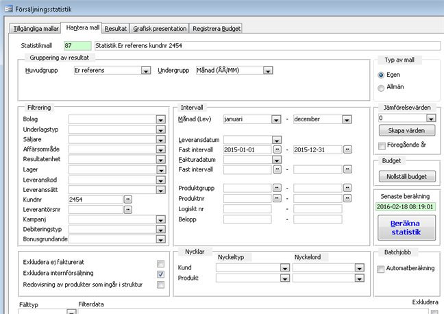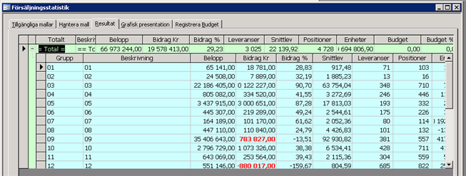 I fliken för försäljningsstatistik väljer man ur en listbox vilken mall man vill se statistik för. I listboxen finns alla egna och allmänna statistikmallar som är huvudgrupperade per kund. Det som visas i statistikfliken avser vald kund i kundfrågan och är grupperat på den undernivå som finns i mallen. Det sker ingen beräkning i samband med att man väljer en statistikmall, så för att statistiken alltid ska vara aktuell i kundfrågan rekommenderar vi att man sätter upp ett batchjobb som uppdaterar statistiken varje natt.