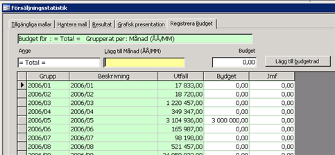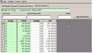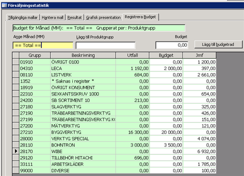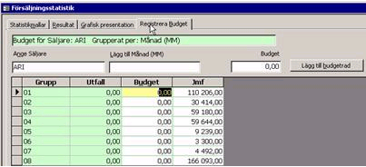 Då man vill registrera en budget markerar man en huvudgrupp i ett resultatfliken varefter man markerar fliken Registrera Budget. Budgetvärden underhålls mot postens undergrupper. I bilden nedan har man valt en specifik säljare som ingår i en undergrupp till en statistikmall som bygger på säljarstatistik indelat i månader. Textrutan längst upp visar information om vad som valts.