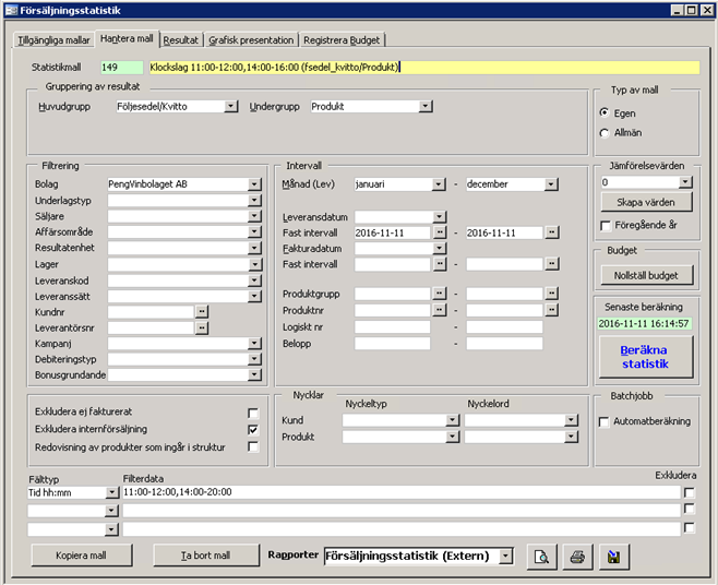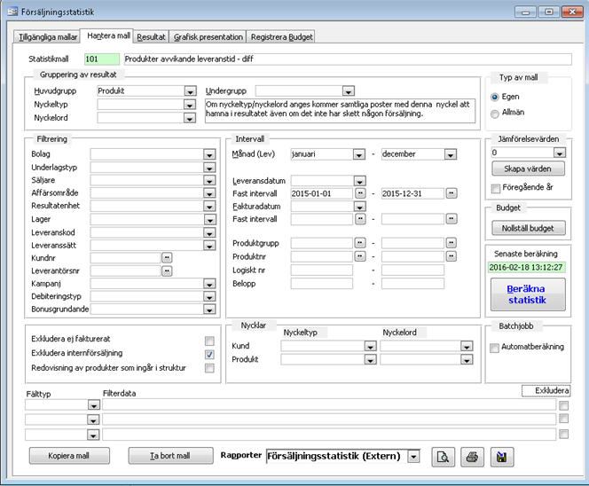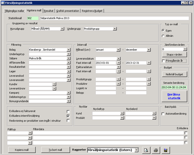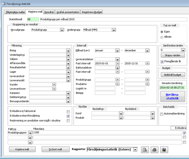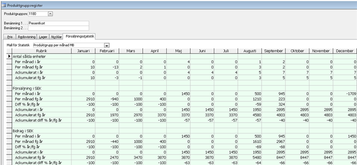 I fliken för försäljningsstatistik väljer man ur en listbox vilken mall man vill se statistik för. I listboxen finns alla egna och allmänna statistikmallar som är huvudgrupperade per produkt. Det som visas i statistikfliken avser vald produkt i produktfrågan och är grupperat på den undernivå som finns i mallen. Det sker ingen beräkning i samband med att man väljer en statistikmall, så för att statistiken alltid ska vara aktuell i produktfrågan rekommenderar vi att man sätter upp ett batchjobb som uppdaterar statistiken varje natt.