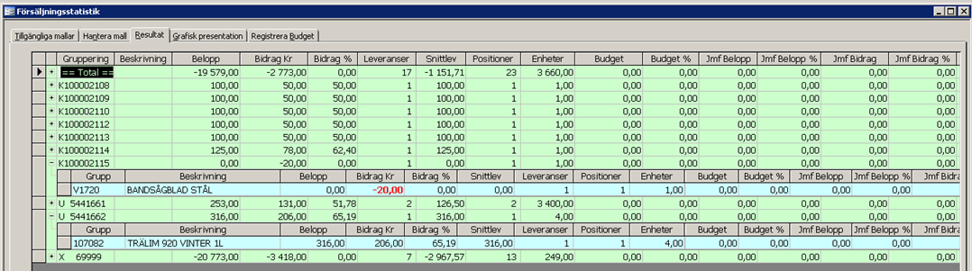 Resultatet presenteras i s k datablad där huvudgrupper bryts ner i undergrupper genom att användaren klickar på +tecknet. Exempel på grupperingar; Per kund och varugrupp eller per säljare och månad.