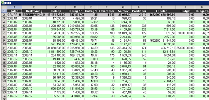 Resultatet blir då en försäljningsstatistik som presenteras per produktgrupp. När man plussar upp raderna visas försäljning per månad och i kolumnerna som inleds med Jmf visas försäljning samma period föregående år.