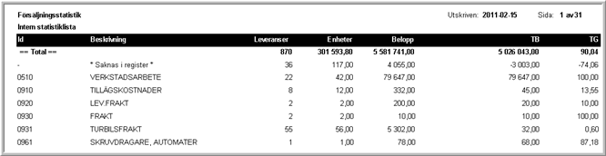 I exemplet ovan kan man se att det sålts varor på godsmottagare som inte finns upplagd på kunden, därför blir beskrivningen på denna *saknas i register*.