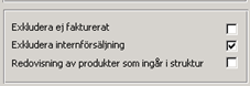 - Strukturhuvud exkluderas om rutan för "Redovisning av produkter som ingår i struktur" är markerad, raderna exkluderas om rutan inte är markerad.