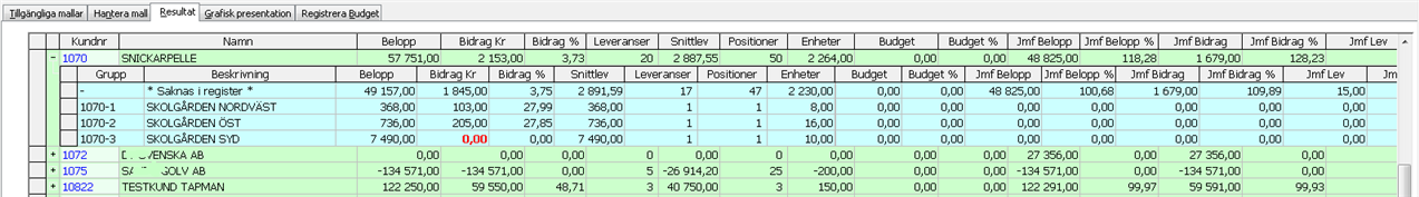 Man kan också komplettera ovanstående mall med undergrupp "Godsmottagare" för att se hur mycket varje godsmottagare/arbetsplats/littera har handlat. Då visas totalen på kundnummerraden och godsmottagarnas köp visas när raderna plussas upp.
