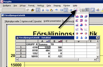Om man vill ändra från stapelvisning till att visa resultatet som en kurva, kräver det att klienten som PENGVIN körs på, är installerad med en fullversion av Office. Har man det, dubbelklickar man på grafobjektet. Då öppnas Microsofts Graf och dess tillhörande menyer dyker upp. Man markerar knappen med staplar på. Då dyker ytterligare diagram-grafer upp. Den underliggande datakällan visas också i tabellform, vilket är en kopia på det som ligger sparat i databasen. Om man kopiera hela diagram-objektet och klistrar in det i ett annat Office-objekt (typ Word eller Excel), följer kopian av datakällan med.