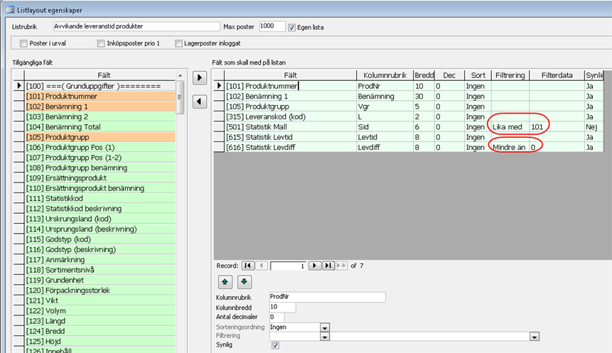 Man kan se t ex göra en lista i produktsökningen på de produkter som har negativt värde i leveransdiffältet genom att ange filtrering till "Mindre än" och filterdata till "0".
