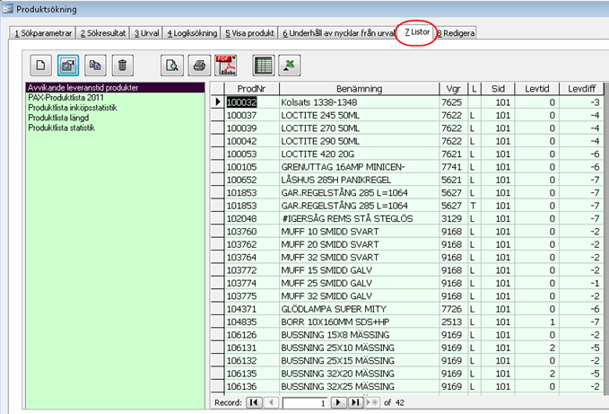 Då får man fram en lista med endast de produkter som har negativ differens i leveranstid. Listan kan man sedan göra om till Excel eller spara som pdf och mejla till berörda medarbetare.