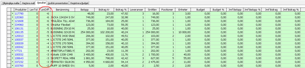 LevDiff Mäter leveranskvalitet. Genomsnittlig differens mellan beräknad och verklig leveranstid. Värdet endast relevant om det finns en bakomliggande order.