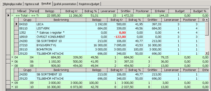 Grupperingsnivåer: ange en huvudgrupp och eventuellt undergrupp för att visa statistiken. Om två grupperingar används kan man under fliken Resultat expandera poster via ett klick på plus-tecknet. Då visas undernivåerna.