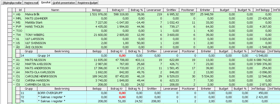 Resultatet visar då försäljning per säljare och klickar man på plusset ser man inom vilka produktgrupper (grupperat på de två första positionerna) säljaren har sålt varor. I exemplet ovan kan man se att det sålts varor på produktgruppsnummer som inte finns upplagda i produktgruppsregistret, därför blir benämningen på dessa *saknas i register*.