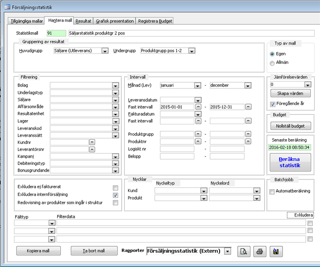 I det här exemplet tar vi fram statistik fördelat per månad för 2015 och jämför med föregående år. Försäljningen av presentkort undantas med villkoret längst ner (fälttyp Produktgruppsnr, filterdata 1180 samt markering för exkludera).