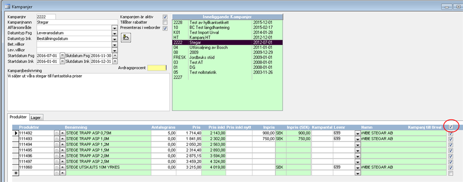 Välj aktuell kampanj och markera i rutan ovanför markeringar. I och med detta flyttas samtliga produkter i kampanjen till eget produkturval.