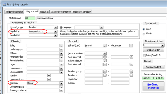 Lägg upp en mall och ange den nyckeltyp som angetts på produkterna, välj aktuell kampanj i filtreringen och ange aktuellt tidsintervall. Starta "Beräkna statistik".