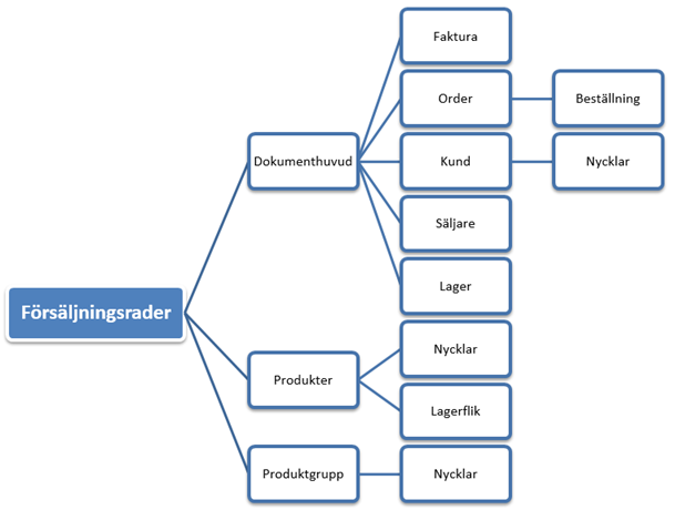 Underlag för försäljningsstatistik utgår från försäljningsraderna. Dessa kan i sin tur ha koppling till produkt- eller produktgruppsregistret som i sin tur kan ha koppling till nycklar och lager. Dokumenthuvudet till försäljningsraderna kan ha koppling till olika register eller andra dokument enligt den schematiska bilden nedan.