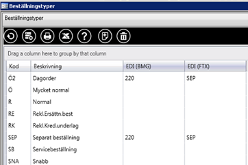 Sök fram beställningsdokumentet efter viss beställningstyp, t ex normal- eller snabbbeställningar, beroende på hur systemet är uppsatt. (Huvudmeny - Referensregister - Beställning - Beställningstyper)