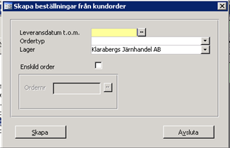 Rutinen för att manuellt fylla på inköpsunderlaget med köpbehovet på anskaffningsvaror (T och D) finns under Huvudmeny – Försäljning – Order – Skapa beställningar. Inköpsunderlag skapas inte på kundorder som är spärrad.