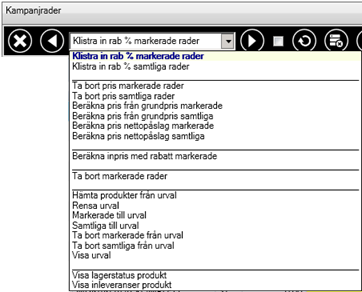 Genom att ange en rabattprocent på samtliga rader kan man genom att välja kommandot räkna ut ett kampanjpris utifrån grundpriset. Därefter tar man bort rabatten på raderna (annars får kunden både kampanjpris och rabatt).