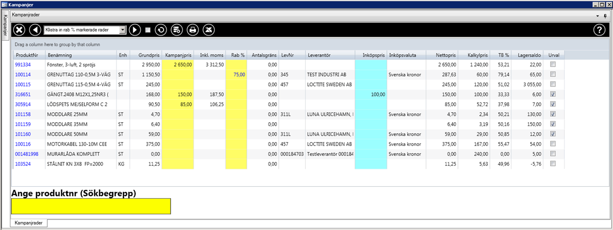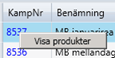 Genom att högerklicka på kampanjnumret och välja "Visa produkter" öppnas fönstret för underhåll av kampanjrader.