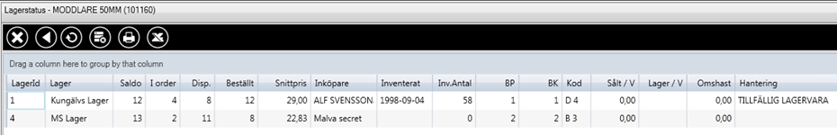 Visar hur tillgången ser ut på de olika lagren samt inventering, beställningspunkter/-kvantiteter mm