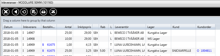 Visar de olika inleveranserna som är gjorda på aktuell produkt. Genom att högerklicka på beställnings- eller ordernummer kan man förhandsgranska beställningen och eller ordererkännande och vid behov därifrån skriva ut dokumentet.