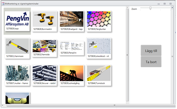 Dialogen används för att lägga till eller ta bort bilder som används som reklambudskap på signeringsterminalen då den inte används. Om man väljer att ha flera olika bilder som visas anger man tidsintervall för bildbyte i en config-fil.
