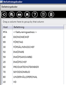 Befattningskoder lägga upp och knyts på kundernas kontaktpersoner, dels för att kunna se vilken position en viss person har, dels för att kunna selektera ut vissa befattningspersoner vid t ex utskick.
