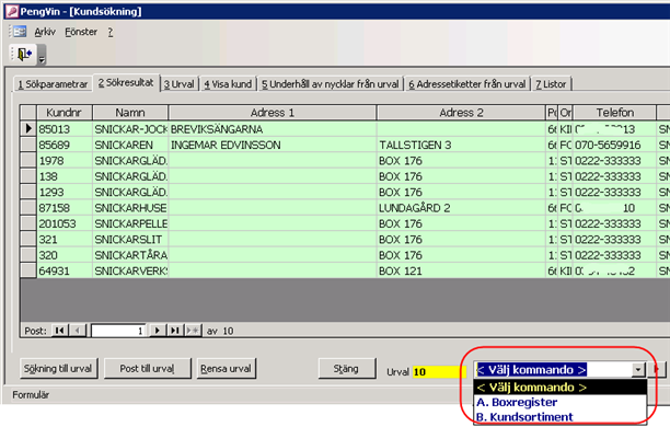 Dialogen för underhåll av kundsortiments öppnas normalt från kundregistrets "Visa"-meny, men man har också möjlighet att sätta upp PENGVIN-systemet så att denna även blir åtkomlig från kundsökningen, se beskrivning "Kundsortiment från kundsökning" nedan.
