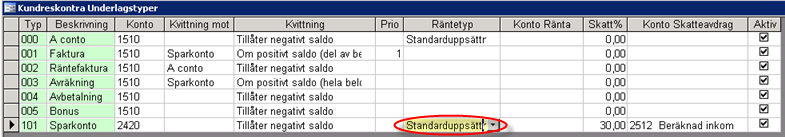 I tabellen T_RESK_TRANSAKTIONSTYPER måste sparkontot läggas upp.