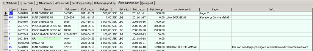 För de betalda fakturorna som återrapporterats gäller samma som för fakturorna under Betalningsuppdrag. Dvs det går att makulera en kontering fast fakturan är återrapporterad. Om den ursprungliga konteringen innehåller kommande periodiseringar så skapas även makulleringar på dessa, med rätt datum, så man behöver inte åtgärda dem manuellt.