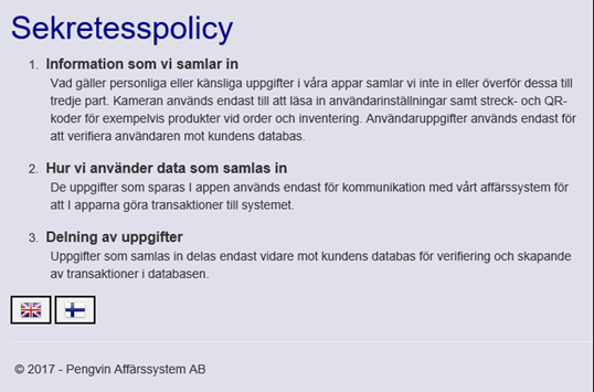Vi måste enligt Google ha en sekretesspolicy eftersom vi använder kameran i våra appar. Policyn finns på nedladdningssidan http://pvonline.pengvin.se/policy/. Den är också tillgänglig inifrån appen.
