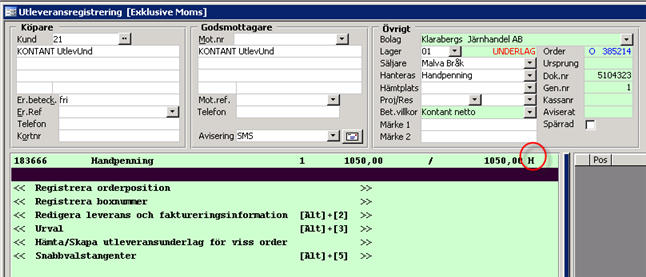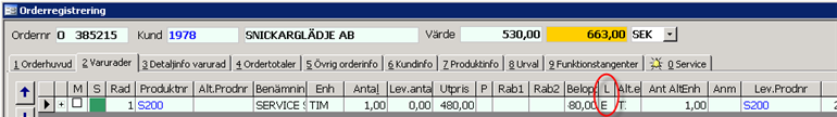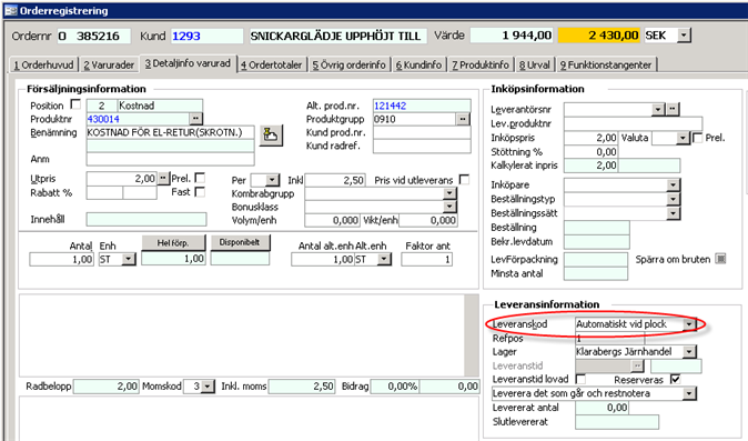 OBS Räknar ej om priser och rabatter. Om kundens rabatt varierar beroende på vilken leveranskod produkten har (och man vill att ”direkt-rabatten” ska hämtas fram), är det bättre att ange leveranskod Direkt i fältet lev.kod innan raderna registreras.