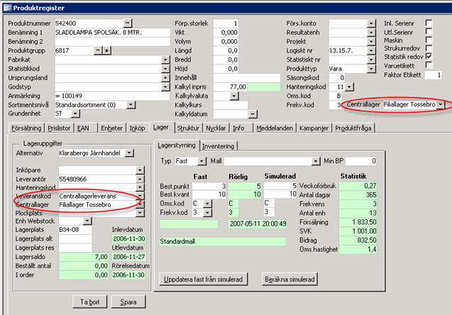 Det centrallager som angetts på lagret överstyr centrallager på produktens grunduppgifter, om fältet lämnas blankt i lagerfliken gäller det centrallager som finns angivet på produkthuvudet.