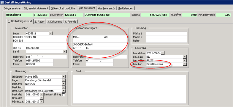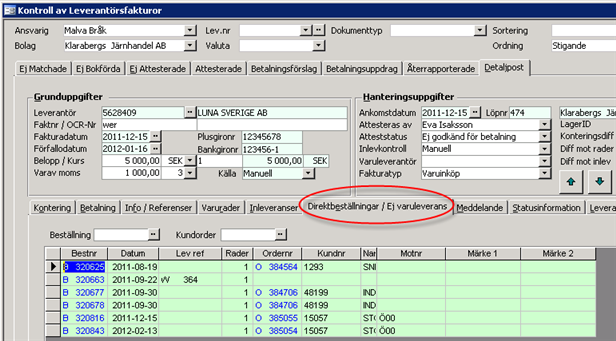 I leverantörsreskontrans flik "Direktbeställningar/Ej varuleverans" hittar man de beställningar som har leveranskod D och man kan även göra inleverans av dessa, med automatik, ifrån denna dialog.