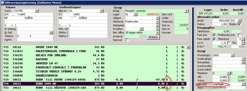 De rader som skapas i samband inleverans av spannmål till legolager får leveranskod "G".