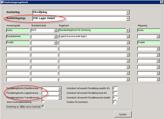Försäljningskonto vid transitleverans om annat ej är angivet på produkt eller produktgrupp. Om fältet lämnas blankt tas försäljningskontot från "Konto Försäljning".