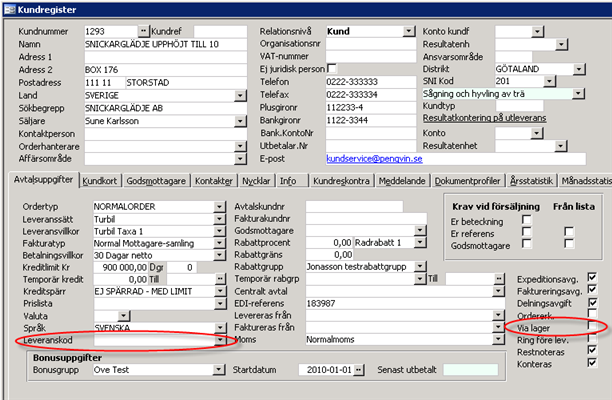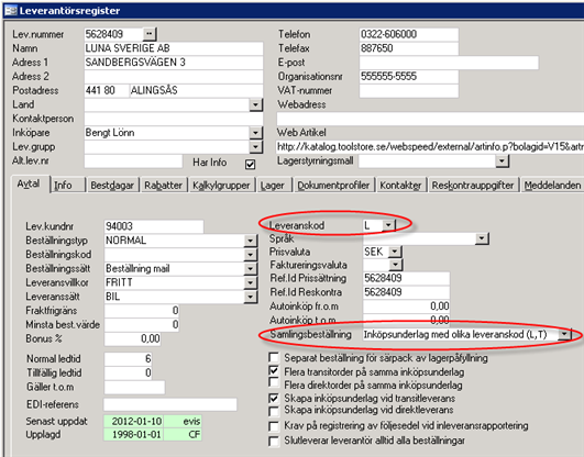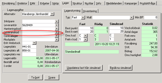 Vilken leveranskod systemet ska föreslå vid registrering av produkten i orderregistreringen. Detta påverkar hanteringen i det fortsatta flödet i systemet. Om det ligger en leveranskod i lagerfliken överstyr den leveranskoden i inköpsfliken. På A-artiklar (=automatiskt vid plock) får det aldrig finnas en leverantör upplagd eftersom A-artiklarna då ligger och "väntar" vid utleverans på att det ska levereras ut nåt annat från samma leverantör. Finns det då inga andra produkter från samma leverantör kommer A-artiklarna aldrig att levereras ut.