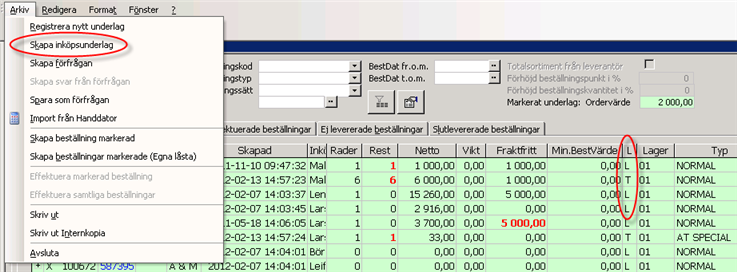 Om den markerade raden är en lagerpåfyllnadsrad (levkod L) kommer den att komma tillbaka igen nästa gång man skapar om inköpsunderlaget, om det då fortfarande finns köpbehov på produkten.