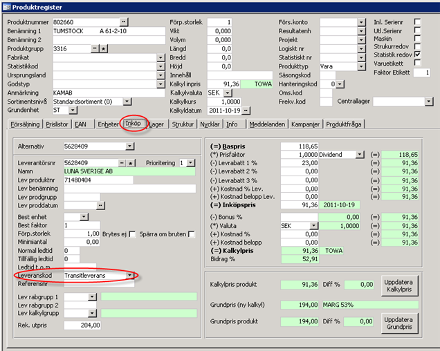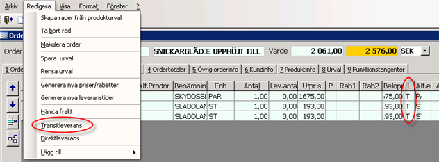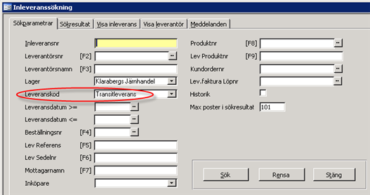 Leveranskoden för varurader med koden direktleverans ändras vid registreringen till leveranskoden transitleverans om rutan är markerad. Är rutan inte markerad behåller varurader med leveranskoden direktleverans sin leveranskod. Markeringen påverkar alltså bara varurader med leveranskod Direkt. Används t ex om man har vissa produkter som är kodade som ”Direkt” i produktregistret, men i det här fallet ska leverantören skicka det via vårt lager istället för direkt till kunden (t.ex för att kunden ska komma och hämta det). Ett alternativ till detta är att gå in på varje enskild rad och byta leveranskod.