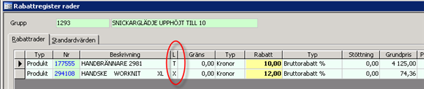 X är ingen leveranskod som finns tillgänglig för upplägg på viss produkt. Den används vid inköp (på beställningshuvudet) när beställningen innehåller både L- och T-rader samt i rabattregistret när rabatten gäller för alla produkter inom gruppen oavsett vilken leveranskod de har.