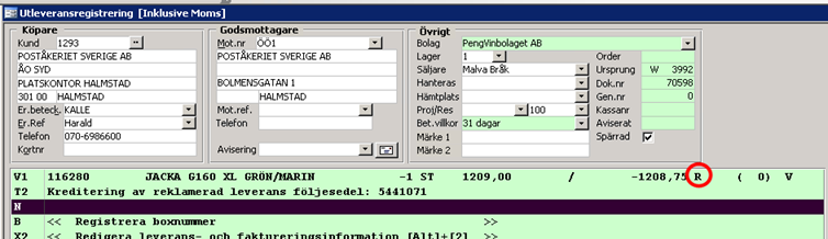 Om man via sökning av utleveranser väljer att skapa kreditering (genom att välja kommandot "B. Skapa kreditering") sätts leveranskoden till "E" på samtliga rader och påverkar således inte lagersaldot.