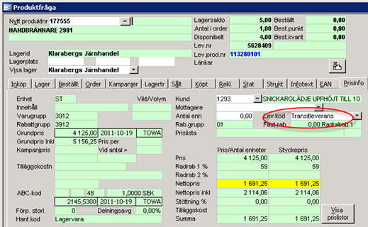 OBS Räknar ej om priser och rabatter. Om kundens rabatt varierar beroende på vilken leveranskod produkten har (och man vill att ”transit-rabatten” ska hämtas fram), är det bättre att ange leveranskod Transit i fältet lev.kod innan raderna registreras.