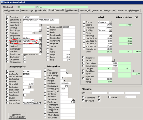 Leveranskoder kan underhållas/ändras via sortiementsunderhållet