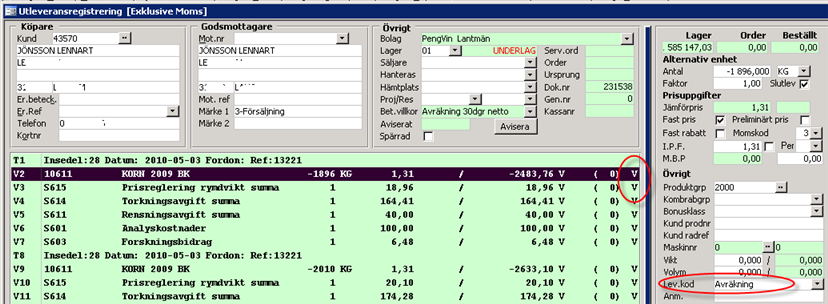 Alla produktrader (t ex korn, havre, torknings- och rensningsavgifter) som kommer via avräkning får levkod V. Dessa konteras då enligt regelverket för inköp.