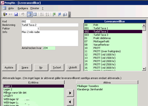 Vid registerunderhåll av leveransvillkor finns det möjlighet att definiera vilka lager som normalt använder respektive leveransvillkor. Leveransvillkor aktiveras för ett lager genom att klicka på pilknappen [>] som då flyttar markerad lagerrad från ”Ej aktiva” till ”Aktiva”. För att ta bort ett lager från ett leveransvillkor gör man det omvända med pilknappen [<].