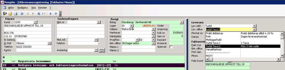 Vid registerunderhåll av leveransvillkor finns det möjlighet att ytterligare beskriva leveransvillkoret i fältet ”Info”. Vid registrering av kundorder och utleverans visas denna extra information när man väljer leveransvillkor.