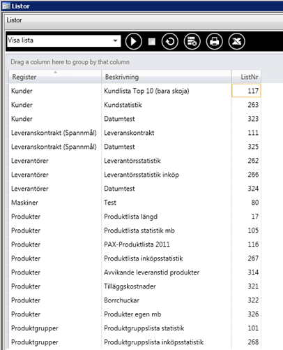 De gamla accesslistorna för produkt, produktgrupp, leverantör och kund har tagits bort. Dessa är ersatta av listgeneratorns listor som finns under den nya menypunkten ”Listor”. Här visas alla egna (inloggad användare) samt gemensamma listor. Listor som andra användare markerat som ”egna” visas inte. Listgeneratorn finns som tidigare i de olika sökdialogerna. Då de nya listorna är kompatibla med jobbservern kan man schemalägga utskrifter av listor.