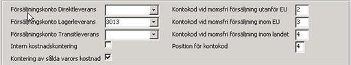 Försäljningskonto vid transitleverans om annat ej är angivet på produkt eller produktgrupp. Om fältet lämnas blankt tas försäljningskontot från "Konto Försäljning".